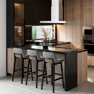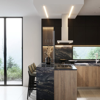 Elementos decorativos en madera y una campana de repisa acentúan la fusión de calidez y modernidad. El cuarzo con textura de concreto agrega un toque vanguardista. AsÃ, la cocina Fontana se convierte en un testimonio de armonÃa y diseño innovador en el entorno natural de Valle de Bravo.