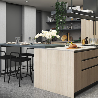 La fusión de un diseño limpio con la calidez de acabados naturales, como la madera tipo Encino y toques en laminado oscuro Vulcano, crea una estética única. Una cubierta clara y un desayunador con toques metálicos añaden contraste y estilo. La campana tipo repisa corona el diseño, otorgando protagonismo a la isla central y completando la elegancia contemporánea de este espacio.