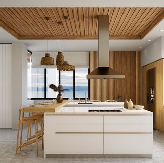 Tonos claros y maderas naturales iluminan el espacio, mientras una isla de doble barra se convierte en el epicentro acogedor del hogar. A través de un ventanal, la luz natural revela el estilo arquitectónico de la casa. Un rincón encantador que abraza la convivencia y la conexión con la naturaleza.